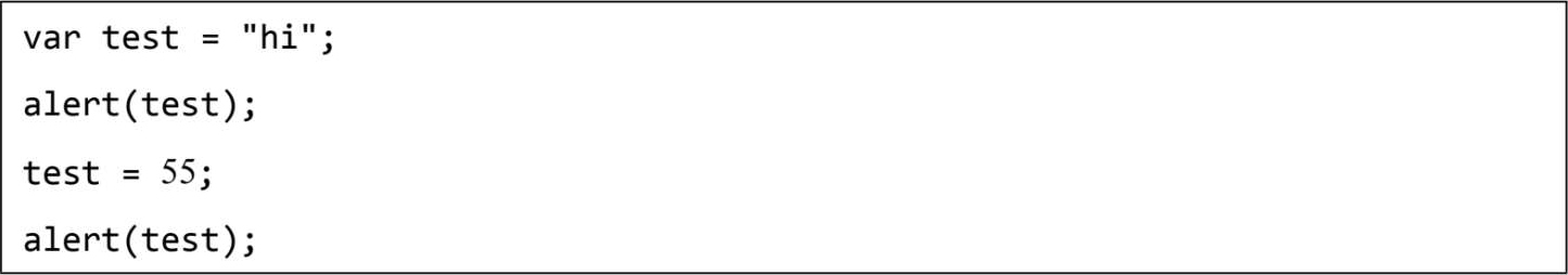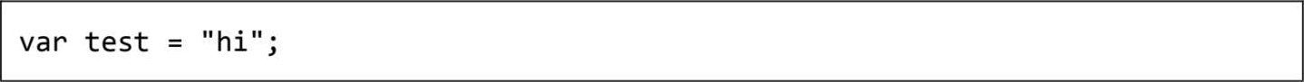 在这个例子中,声明了变量test,并把它的值初始化为"hi"(字符串)。由于JavaScript是弱类型的,所以解释程序会为test自动创建一个字符串值,无须明确的类型声明(稍后将详细介绍“弱类型”)。