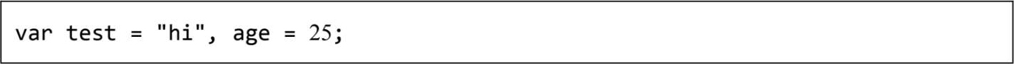 这个例子除了(再次)定义test外,还定义了age,并把它初始化为25。即使test和age属于两种不同的数据类型,在JavaScript中这样定义也是完全合法的。