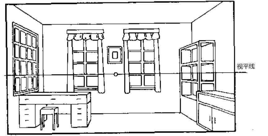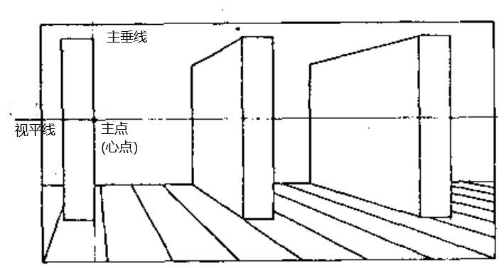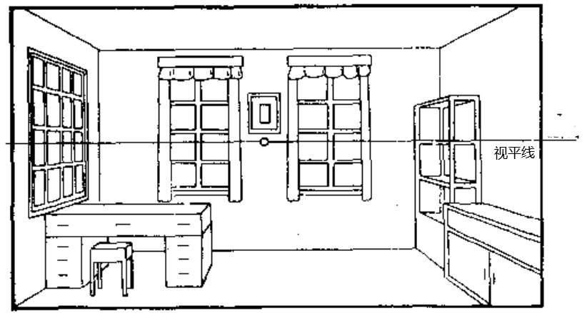 水平视平面与画面的交线叫视平线(用hh 表示),视平线也就是画面上通过主点的一条水平线,视平线和视点同在与基面平行的水平视平面上,因此视平线与视点在同一水平高度上。视平线正是因此而得名。在平视透视图中,视平线与基线的距离反映出视点到基面的距离——视高。