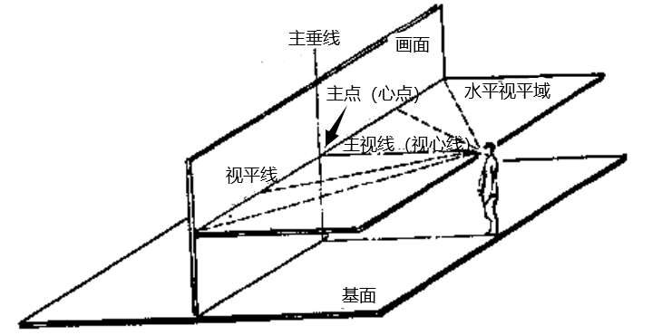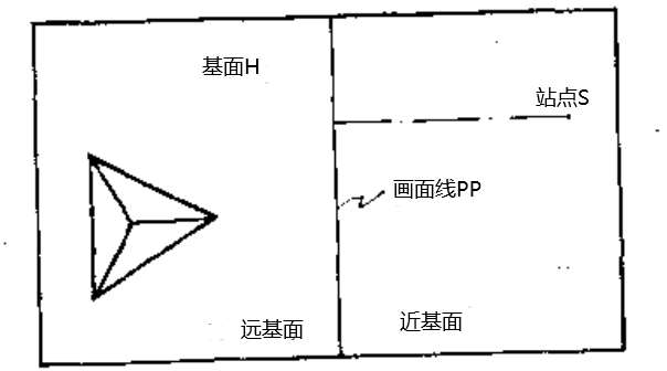 如图1.72所示中包含视点的水平状的平面叫水平视平面,水平视平面与观察者的眼睛(视点)同高,并平行于基面。