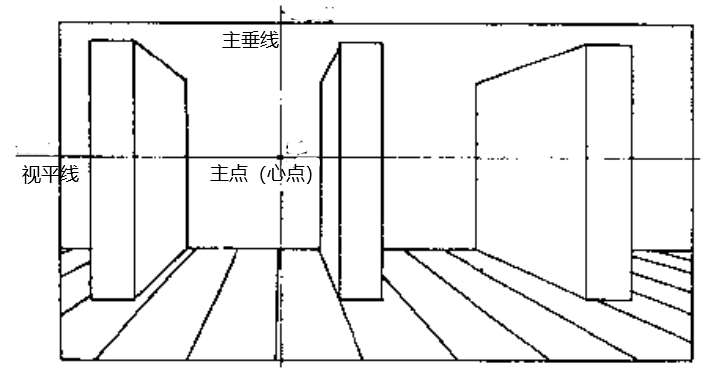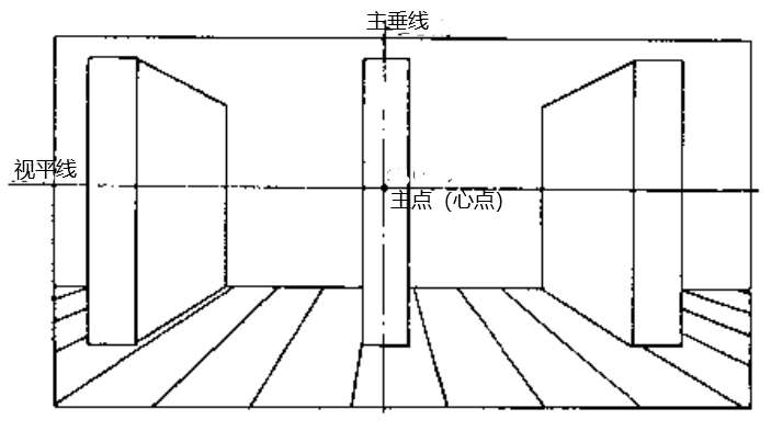 通过主点和心点且与视平线垂直的直线叫主垂线。主垂线把画面分为左右两部分,凡在主垂线左边的景物,只能见其右侧,凡在主垂线右边的景物,只能见其左侧,正对主垂线的景物只能见其正面,看不见它的两个侧面,如图1.69所示。
