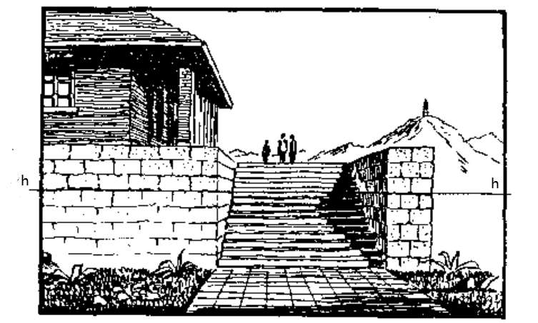 写生时,明显的视平线被景物遮掩,可以观察景物中向远方伸去的与地面平行的水平线或水平面,如砖缝、屋檐、水平窗格、台阶面、桌凳面等。这些水平线的透视由倾斜趋向水平,同样宽窄水平面的透视由宽趋向窄,根据这些可以估计出视平线的位置。