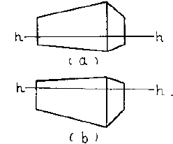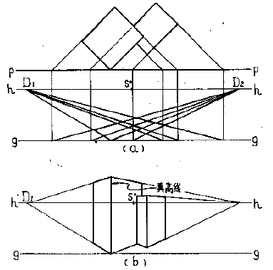 上下水平变线的透视角度上下对称,透视轮廓呆板。应如图2.10所示(a)、(b)适当升高或降低视平线,透视效果即可改观。