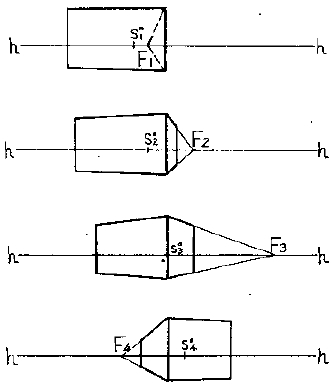 (3)视点位置的选择应使物体与画面夹角适当,保证透视图效果好并有一定体积感。如图2.6所示中,视点在S1位置时,物体两侧立面与画面的夹角一个过大,一个过小,只能见到一个面,透视图完全没有体积感,透视效果不好。视点在S,的位置时,一个灭点过近,侧面过窄,正面过宽,不能充分表现体积感,透视效果欠佳。视点在S4位置时,透视图效果也不好。视点位置在s1 时,物体与画面夹角适当,透视图的体积感较强,效果较好。