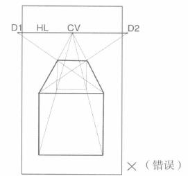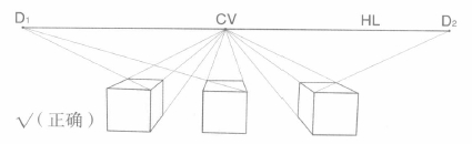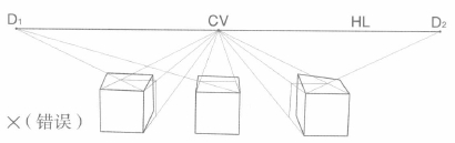 (2)如图3.11A、3.11B:平行透视各消失点不统一,平行透视各消失点不在一条视平线上,3.11C 为正确图。