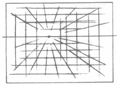 (1)如图3.7A所示:在画面上确定视平线、主点,设想画面上布满由横线、竖线和从主点引出的辐射线组成的网格,并用虚线画出。