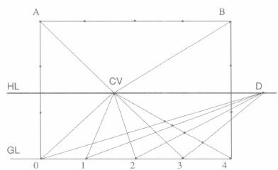 (2)按室内实际比例尺寸4米宽、3米高确定房间外框,并标上刻度。设定GL 线、HL 线、CV点和距点D。分别过CV点作A、B和0、l、2、3、4 各点的连线,过D点分别作0、1、2、3、4 各点的连线,如图3.6B所示。