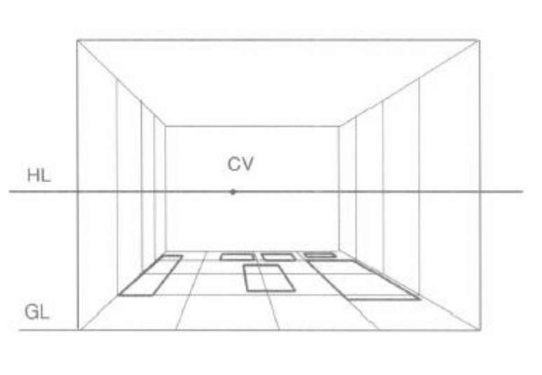 (1)定视点E,视平线HL,主点CV。画与画面平行的正方形ABCD。从ABCD 各引消失线至主点CV。