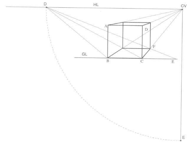 (2)延长BC 线得E点,BC=CE。由E点引线至距点D 得F点(即CCV 线与ED 线交叉点),CF 之长就是正方形伸向远方的透视长(深)度。