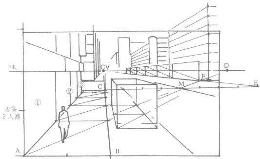 (2)远处人行道转角C点是人行道的宽度,仍为2人高。以此为准,连线CE,得马路宽度,为16人高;自中点M 连线CV 并反向延长,为马路中线。连线MD 交E 至主点于F,EF是马路十字路口深度。