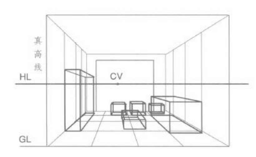 平行透视中,方形物三组棱边分别是宽度、高度、深度,它们的透视方向是:水平、垂直、向主点。这也是多件方形物组成平行透视场景的线段的透视方向。利用这个规律,可以快速画出平行透视场景的近似图。