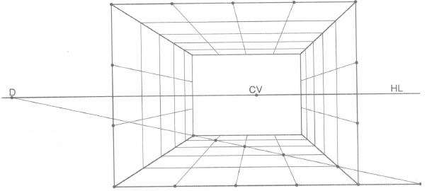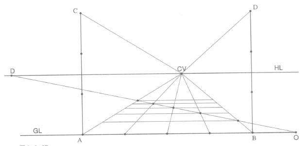 (1)定出视平线HL,主点CV,按比例定出宽度尺寸AB,AB 线段位于基线上,过CV 作A、B 及各点的连线,确定距点D,DCV 的距离等于视距,如图3.5A所示。