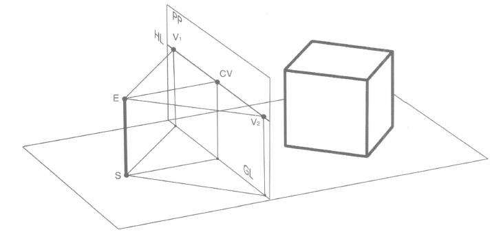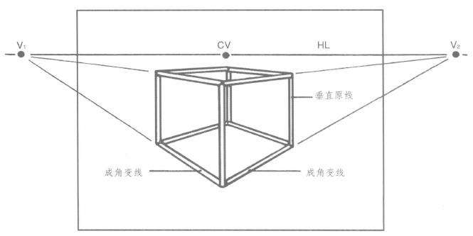 以立方体为例,只要离画幅最近的是立方体的一个角,那么立方体左右两个竖立面必然与画幅呈一定角度,且两角相加为90°,在这种情形下作图称为成角透视。由于它有两个消失点,两个角互为余角,所以又叫“二点透视”“余角透视”。(图4.1 A、B)