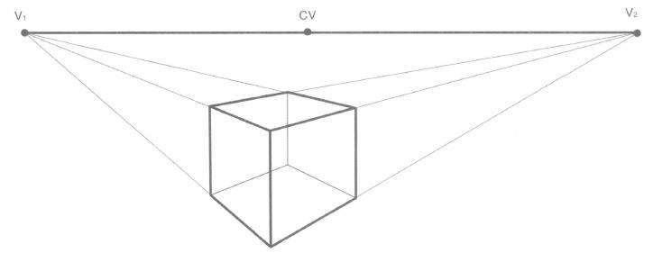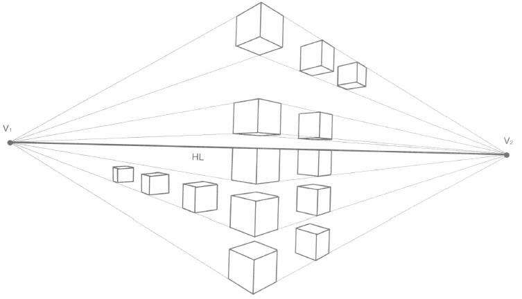 (2)边线为平行于基面的成角变线,左右各一组,水平消失方向不一,形成两个灭点,都在视平线上。(图4.1B、图4.3)