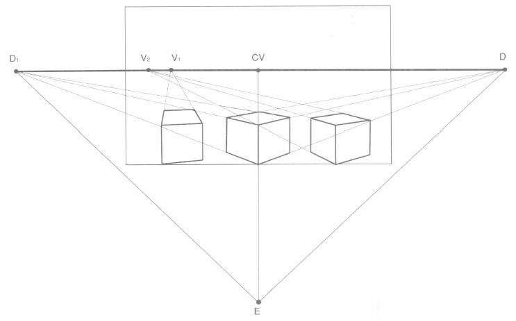 (2)同一立方体左右两组成角边形成的两个灭点处在主点两侧。当立方体成角边与画面成45°角时,两个灭点即左右距点;当立方体成角边与画面成非45° 也非90°角时,一个余点处在同侧距点之内,另外一个余点处在同侧距点之外,两个余点到主点的距离成反比。(图4.3)