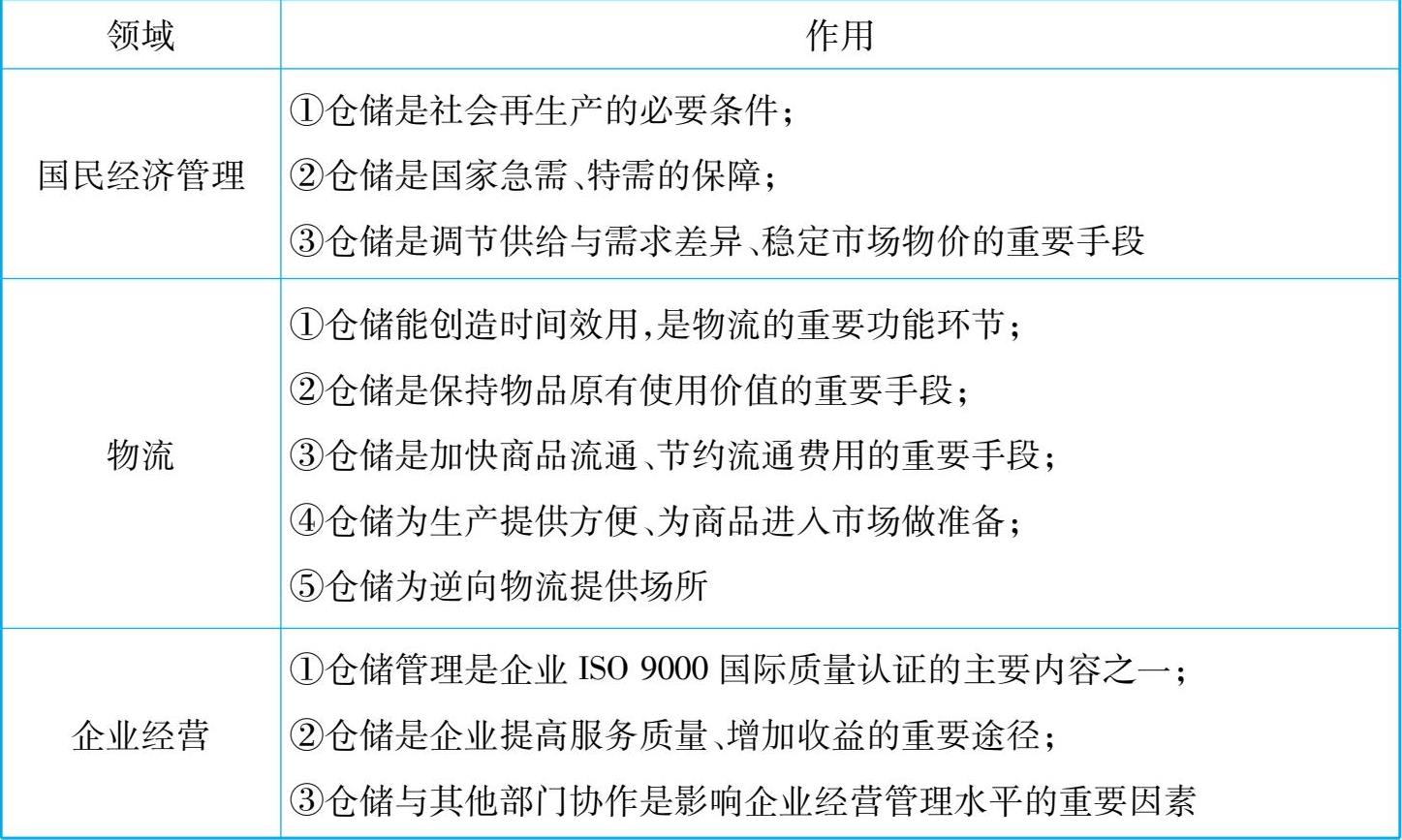 仓储在国民经济管理、物流、企业经营等领域都起着重要作用,见表 1-1。