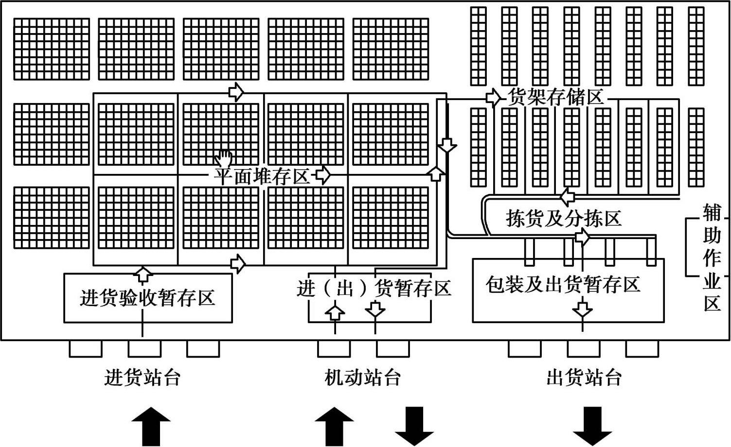 纵横式布局是克服横列式和纵列式的缺点,结合两者的优点,根据不同货区的不同要求和特点,设计不同的横列式和纵列式。比如,对快流商品的地面堆叠或横梁式货架,我们使用横列式布局;对慢流商品,使用轻型货架宜纵列式布局。当然,横列式和纵列式布置还要充分考虑仓库的客观条件限制,如图 1-3所示。