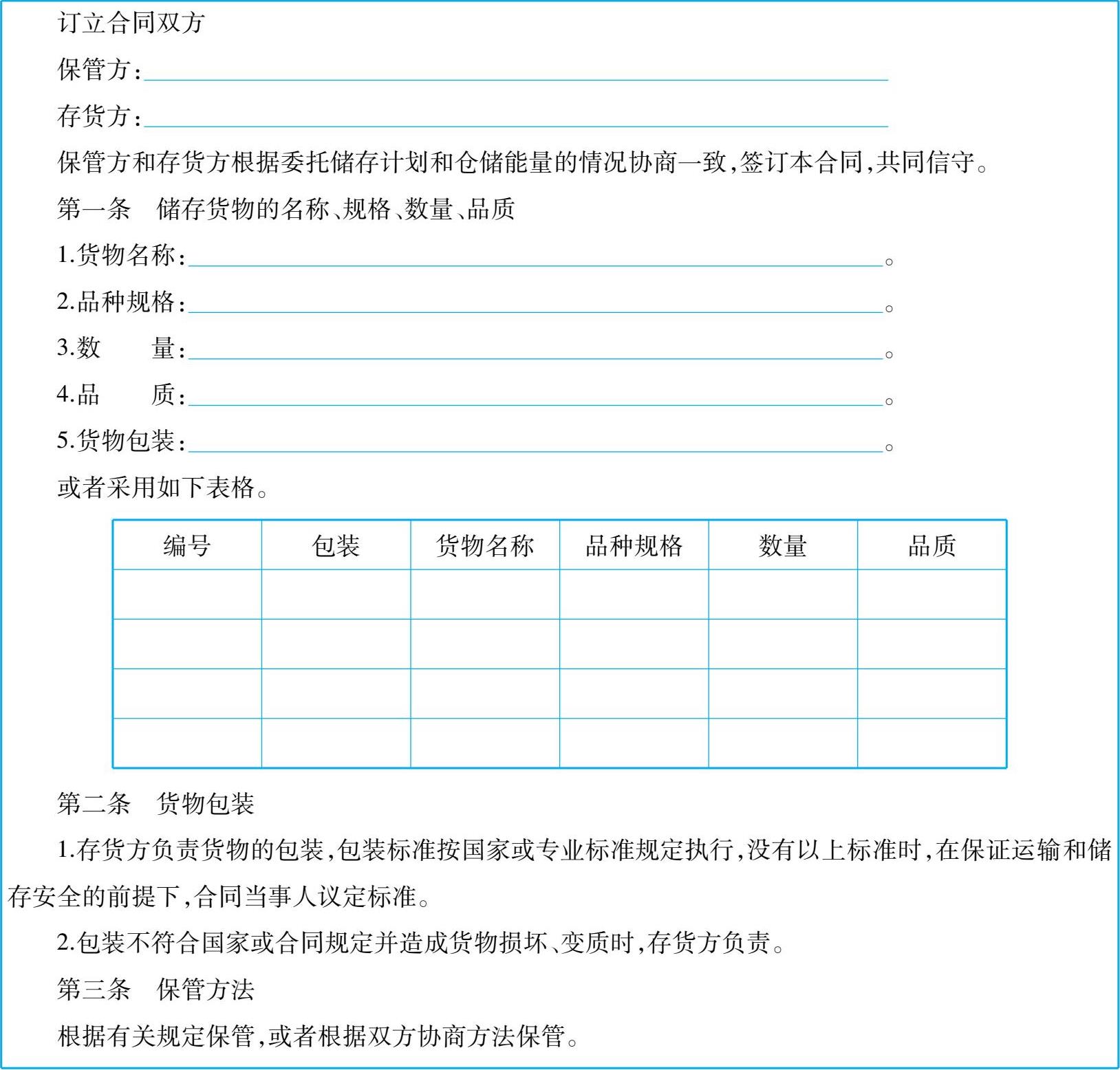 仓储合同的主要条款一般包括物品的品名或品类;物品的数量、品质、包装;物品验收的内容、标准、方法、时间;物品的保管条件和保管要求;物品进出库的手续、时间、地点、运输方式;物品的损耗标准和损耗处理;计费项目、标准和结算方式、银行、账号、时间;责任划分和违约处理;合同的有效期限;变更和解除合同的期限。