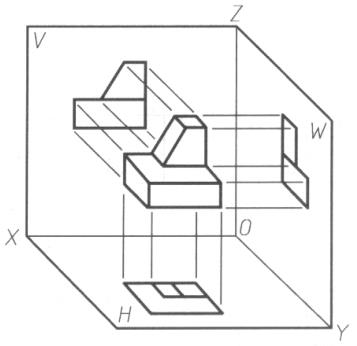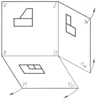 为了将处在空间位置的三个投影图画在一张纸上,需要将三个投影面展开,展开时使正立面V不动,将水平面H绕OX轴向下旋转90度,将侧立面W绕OZ轴向右旋转90度,如图2.9所示,这样就将三个投影图摊在了一个平面(图纸)上。