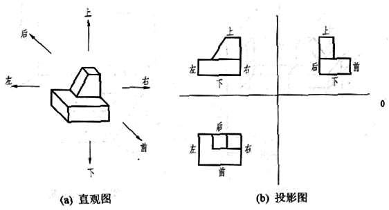 形体的“上下、左右”方位明显易懂,而“前后”方位则不够直观,分析水平投影和侧面投影可以看出,“远离正面投影的一侧是形体的前面”。用“远离正面的是前面”这一口诀,可帮助大家分辨和记忆视图与形体的方位关系。