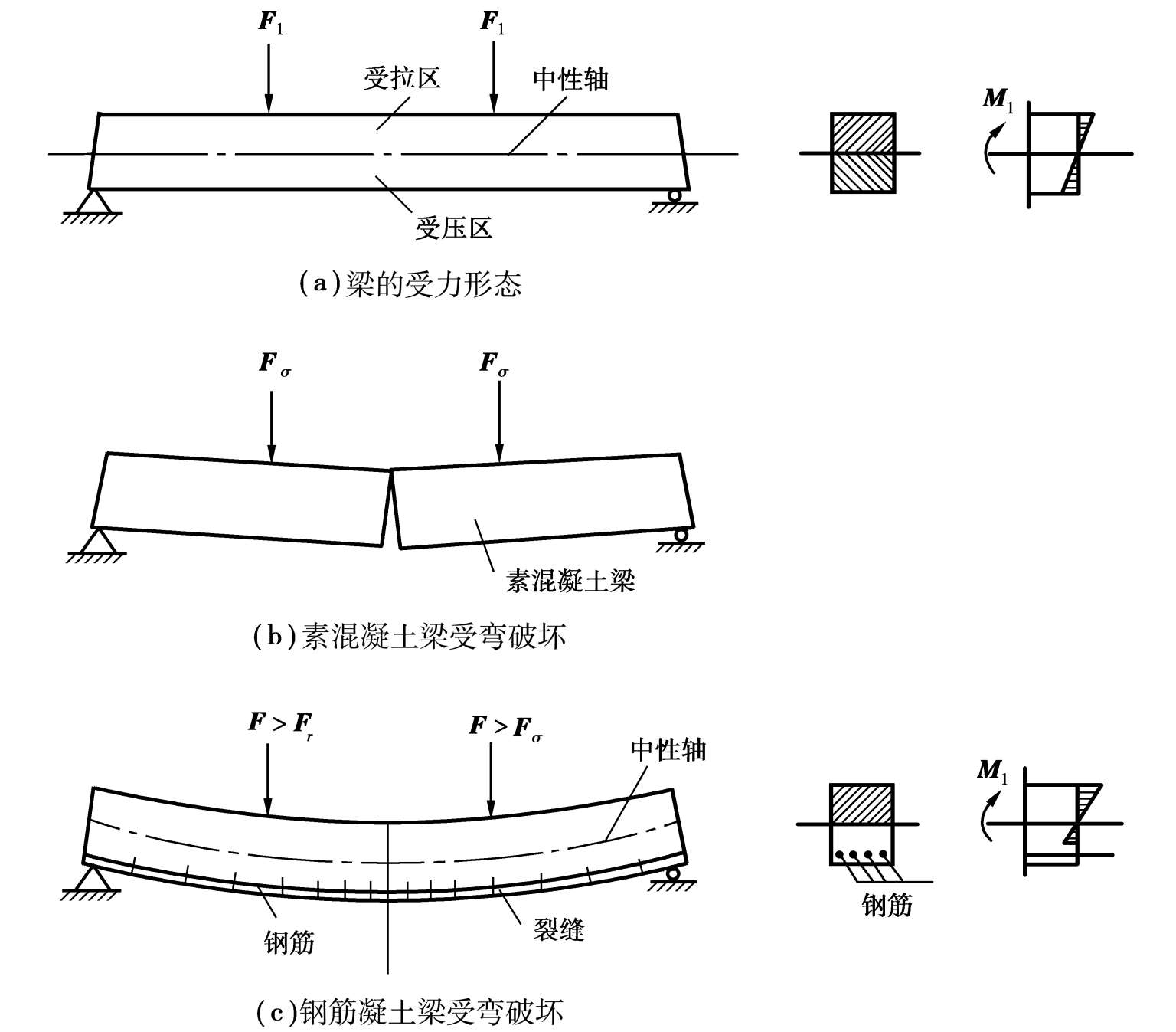 图 1.22 素混凝土梁和钢筋混凝土梁的受力破坏情况