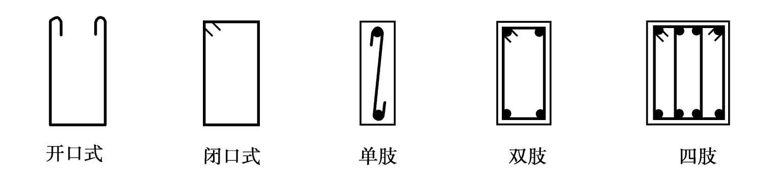 箍筋主要是用来承受由剪力和弯矩在梁内引起的主拉应力,同时还可固定纵向受力钢筋,并与其他钢筋一起形成立体的钢筋骨架。箍筋的最小直径与梁高有关:当梁高h≤800 mm时,箍筋直径不宜小于6 mm;当h>800 mm时,不宜小于8 mm。梁中配有计算需要的纵向受压钢筋时,箍筋直径还应不小于d/4(d为纵向受压钢筋最大直径)。箍筋分开口和封闭两种形式。开口式只用于无振动荷载或开口处无受力钢筋的现浇T形梁的跨中部分,除此之外均应采用封闭式。箍筋的肢数按如下规定采用(图4.5):