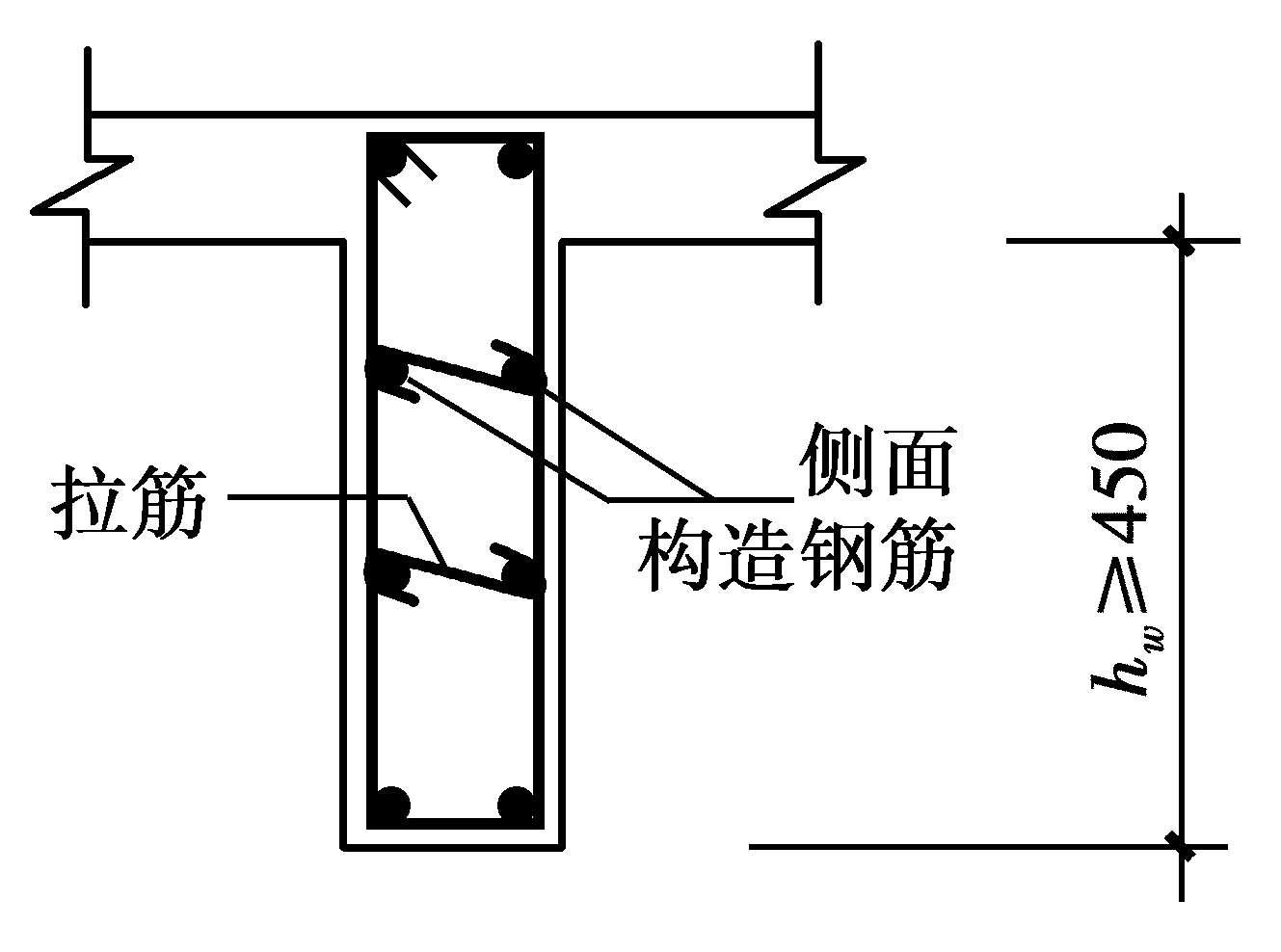 当梁的腹板高度h w ≥450 mm时,在梁的两个侧面应沿高度配置纵向构造钢筋,每侧纵向钢筋的截面面积不应小于腹板截面面积bh w 的0.1%,且其间距不宜大于200 mm钢筋(图4.6),并用直径为6 mm的拉筋相连,拉筋的间距一般为箍筋间距的2倍。