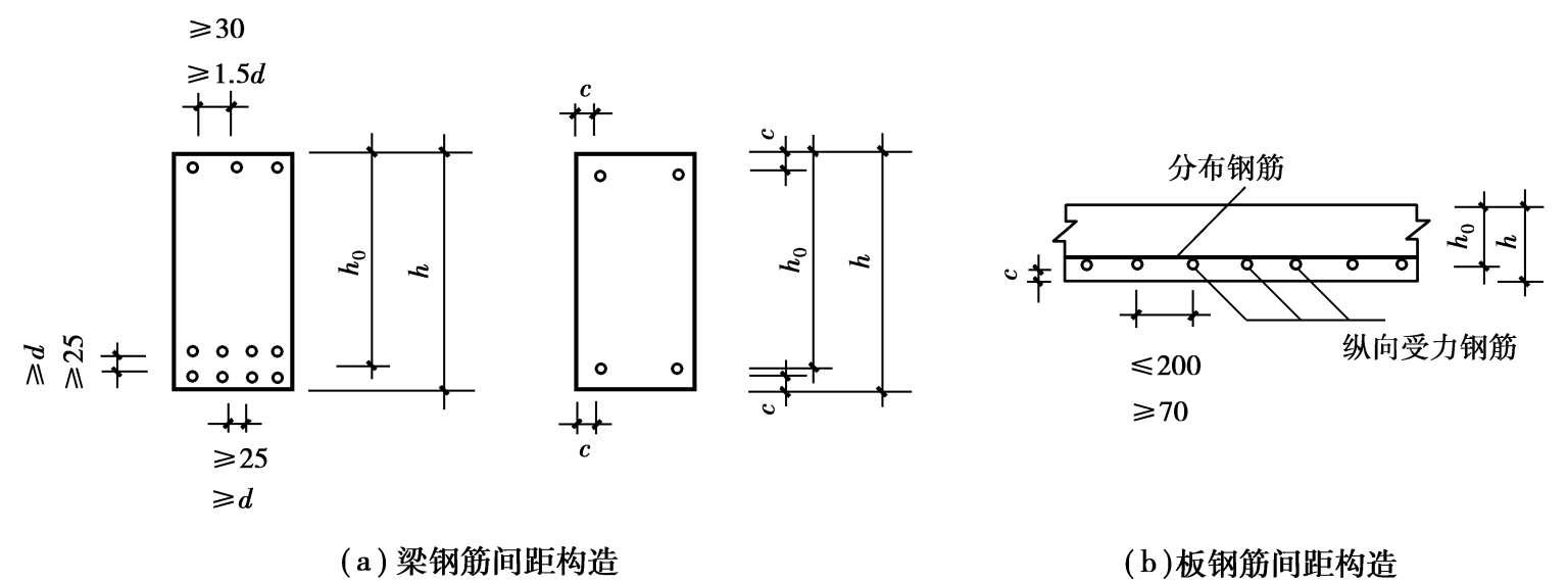 梁中的钢筋有纵向受力钢筋、弯起钢筋、箍筋和架立钢筋等,纵向受力钢筋的作用是承受由弯矩在梁内产生的拉力。常用直径为12~35 mm。当梁高h≥300 mm时,其直径不应小于10 mm;当h<300 mm时,不应小于8 mm。为保证钢筋与混凝土之间具有足够的黏结力和便于浇注混凝土,梁的上部纵向钢筋的净距不应小于30 mm和1.5d(d为纵向钢筋的最大直径),下部纵向钢筋的净距不应小于25 mm和d[图4.4(a)],梁的下部纵向钢筋配置多于两层时,钢筋水平方向的中距应比下面两层的中距增大1倍。