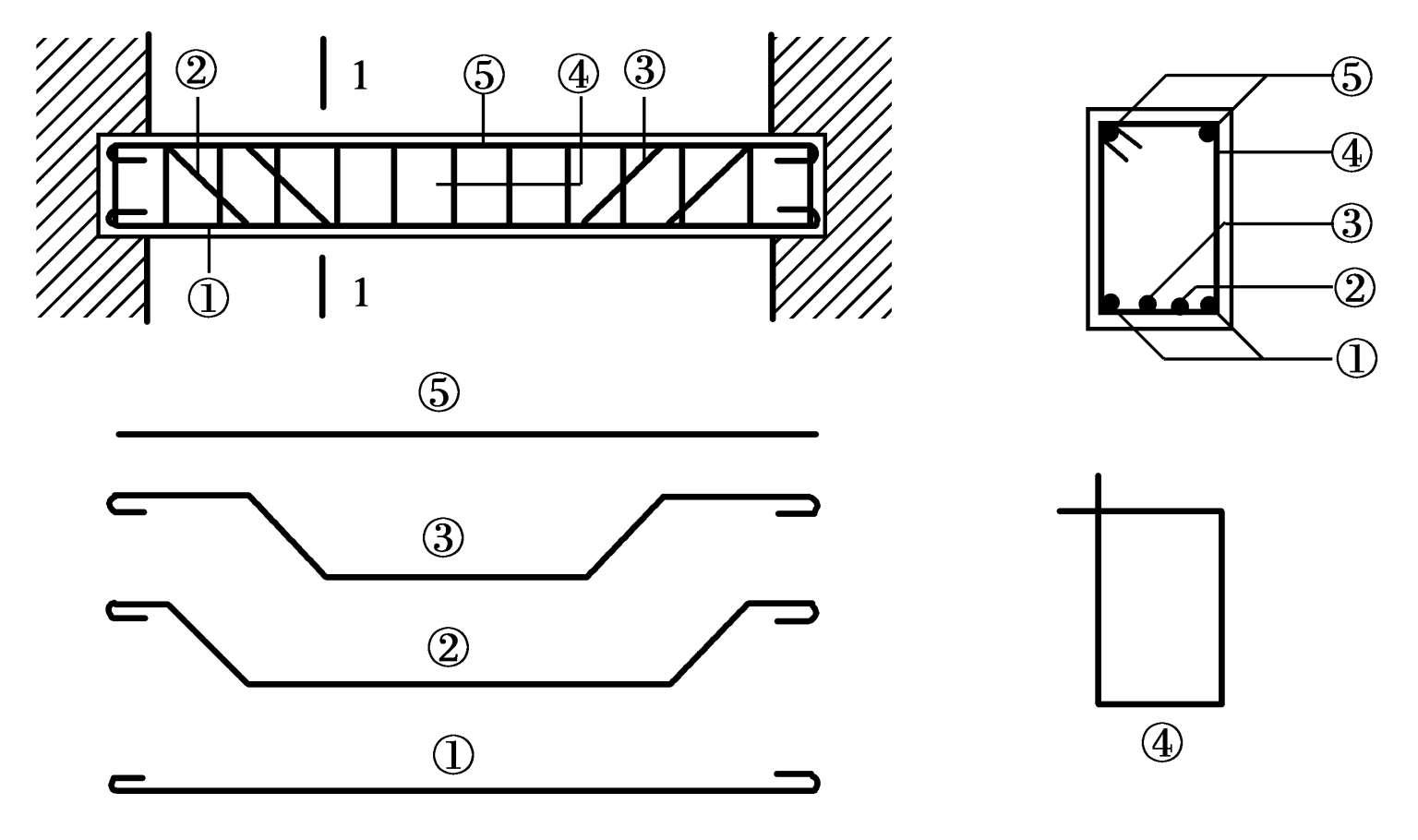 弯起钢筋的数量、位置由计算确定,一般由纵向受力钢筋弯起而成(图4.7),当纵向受力钢筋较少,不足以弯起时,也可设置单独的弯起钢筋。弯起钢筋的作用是其弯起段用来承受弯矩和剪力产生的主拉应力;弯起后的水平段可承受支座处的负弯矩。弯起钢筋的弯起角度:当梁高h<600 mm时,采用45°;当梁高h≥600 mm时,采用60°。