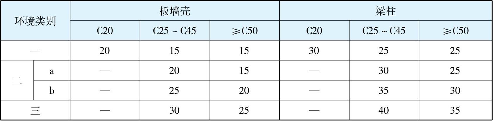 ②处于一类环境且由工厂生产的预制构件,当混凝土强度等级不大于C20时,其保护层厚度可按表中规定减少5 mm,但预制构件中的预应力钢筋的保护层厚度不应小于15 mm;处于二类环境且由工厂生产的预制构件,当表面另作水泥砂浆抹面层且有质量保证措施时,保护层厚度可按表中一类环境数值取用。