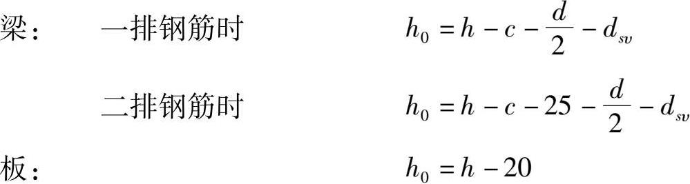 计算梁、板承载力时,因为混凝土开裂后,拉力完全由钢筋承担,则梁、板能发挥作用的截面高度应为从受压混凝土边缘至受拉钢筋截面形心的距离,这一距离称为截面有效高度,用h 0 表示(见图4.4)。在室内正常环境下,设计计算时h 0 可按如下近似数值取用: