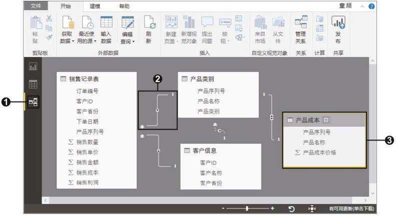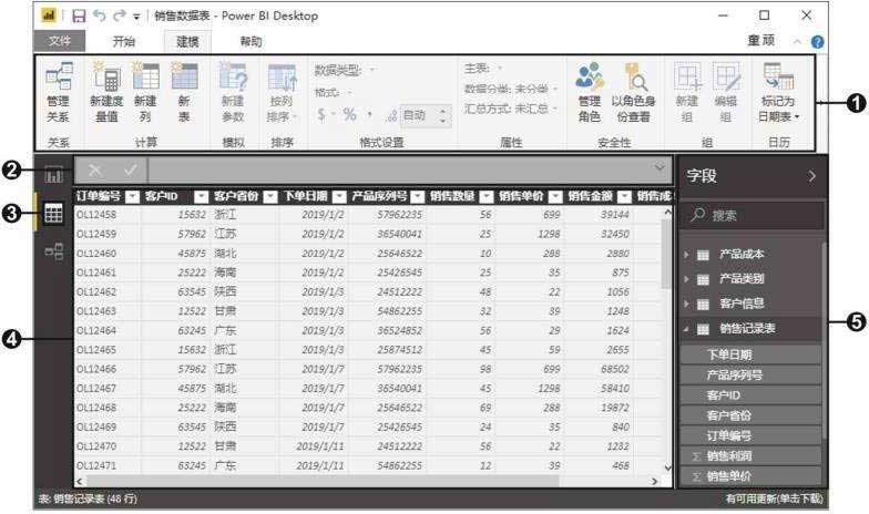 (1) 建模功能区,在此处可管理关系、新建度量值、创建计算列和表,并对列的格式进行设置。