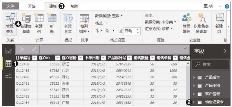 步骤01管理关系。打开原始文件,①切换至数据视图中,可在右侧的“字段”窗格中看到导入Power BI Desktop中的表。②单击表名称,会在中间的区域显示该表中的数据内容。③切换至“建模”选项卡。④单击“关系”组中的“管理关系”按钮,如图2.53所示。