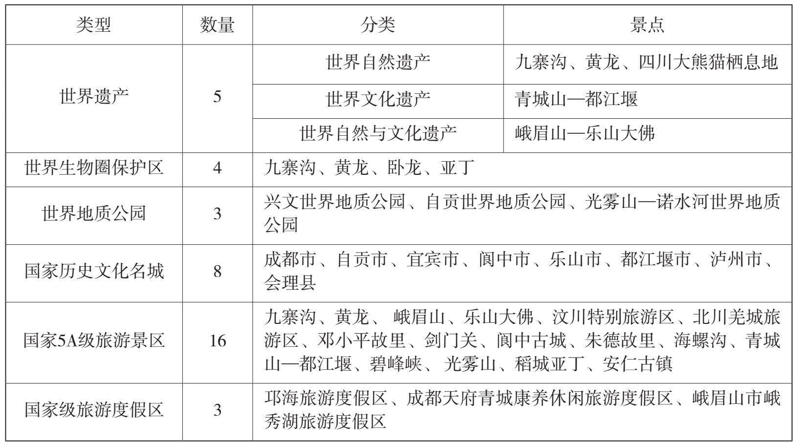 四川的旅游资源极为丰富,历来有“天下山水在于蜀”之说。除了自然山水风光外,长江、黄河两大流域文明的精华,更是哺育出巴蜀地区璀璨的历史文化及民族民俗文化。四川历史文化悠久,以三星堆、金沙遗址为代表的古蜀文明璀璨而神秘,有国家历史文化名城8个,全国重点文物保护单位262处,蜀锦、四川皮影戏等被列入联合国教科文组织非物质文化遗产名录项目。四川为中国道教发源地之一,全世界最早的纸币“交子”出现地,三国文化、红色文化、民族文化、宗教文化灿烂多姿。四川省世界及国家级旅游资源如表3-1所示。