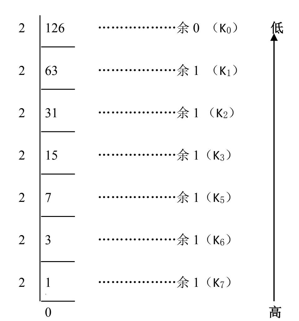 整数部分的转换采用的是除2取余法。其转换原则:将该十进制数除以2,得到一个商和余数(K 0 ),再将商除以2,又得到一个新商和余数,如此重复,直到得到商为0和余数(K n-1 ),然后将所得到的各位余数,以最后余数为最高位,最初余数为最低位依次排列,即K n-1 K n-2 …K 1 K 0 。这种方法又称为“倒序法”。