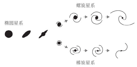 哈勃于1936年建立了星系分类法。我们所在的星系,即银河系,看上去像一条横贯夜空、光芒暗淡的光带,属于棒旋星系。它形如一块旋转着的扁平碟片,宽度约为10万光年,由气体、尘埃和约1000亿颗恒星构成。太阳系并不处于银河系的中心,而是位于一条较小的旋臂上。