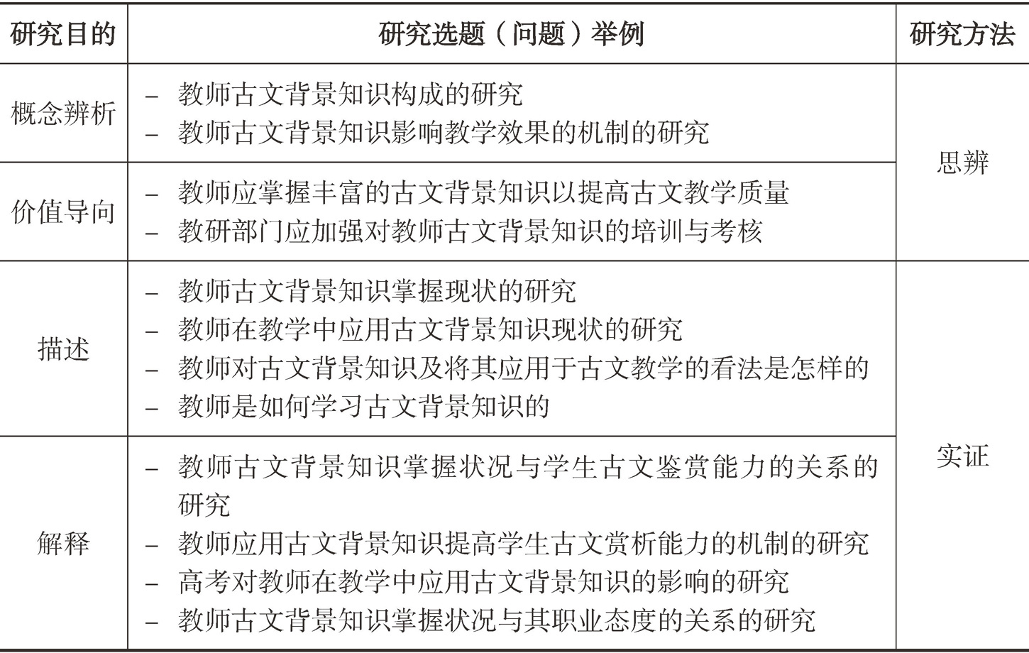 思辨研究的核心是论辨与价值导向,实证研究则以收集和分析实证信息为核心。这两种研究不是绝缘的,更不是对立的,好的实证研究,一定包括研究背景、研究意义、理论基础、概念辨析,这些内容很多都以思辨研究的结果作为基础或素材。例如,“教师应掌握丰富的古文背景知识以提高古文教学质量”和“教师古文背景知识影响教学效果的机制的研究”是思辨研究,“教师在教学中应用古文背景知识现状的研究”和“教师古文背景知识掌握状况与学生古文鉴赏能力的关系的研究”是实证研究,思辨研究澄清了实证研究的价值,并说明了研究中抽象概念的内涵和外延,为收集实证信息奠定了基础;同时,实证研究也有助于证实思辨研究中的理念和理论,澄清其在教育教学中落实的状况。