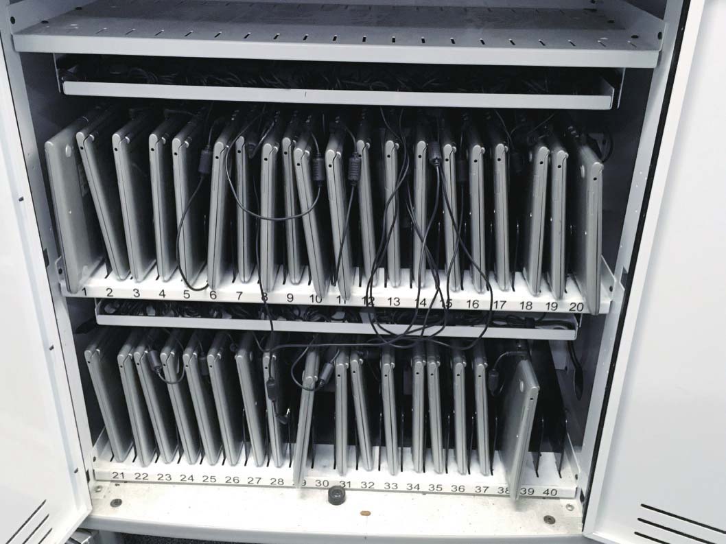 不管在阿凯迪亚学区,还是沙漠沙子学区,几乎每间教室里都有一个移动小推车,放着学生电脑,电脑的名字叫Chromebook,据说是谷歌公司专门为学校设计的。这种电脑整体轻薄,极具便携性,看起来与笔记本电脑无异,但是无法安装任何软件,也没有硬盘,只有高速浏览器。