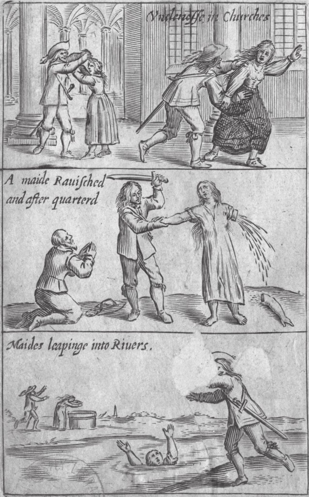 图3 这几幅木版画描述了三十年战争期间,士兵在德意志的土地上对女性犯下的暴行。摘自菲利普·文森特所著的《德意志哀歌》(1638年在伦敦出版)