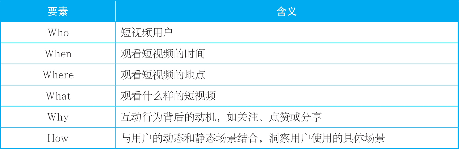 如果只了解用户信息数据,短视频创作者还不能形成对用户的全面了解,应该将用户信息融入一定的使用场景中,才能更加具体地体会用户的感受,还原真实的用户形象。短视频创作者可以采用“5W1H”法来确定用户使用场景,如表2-1所示。