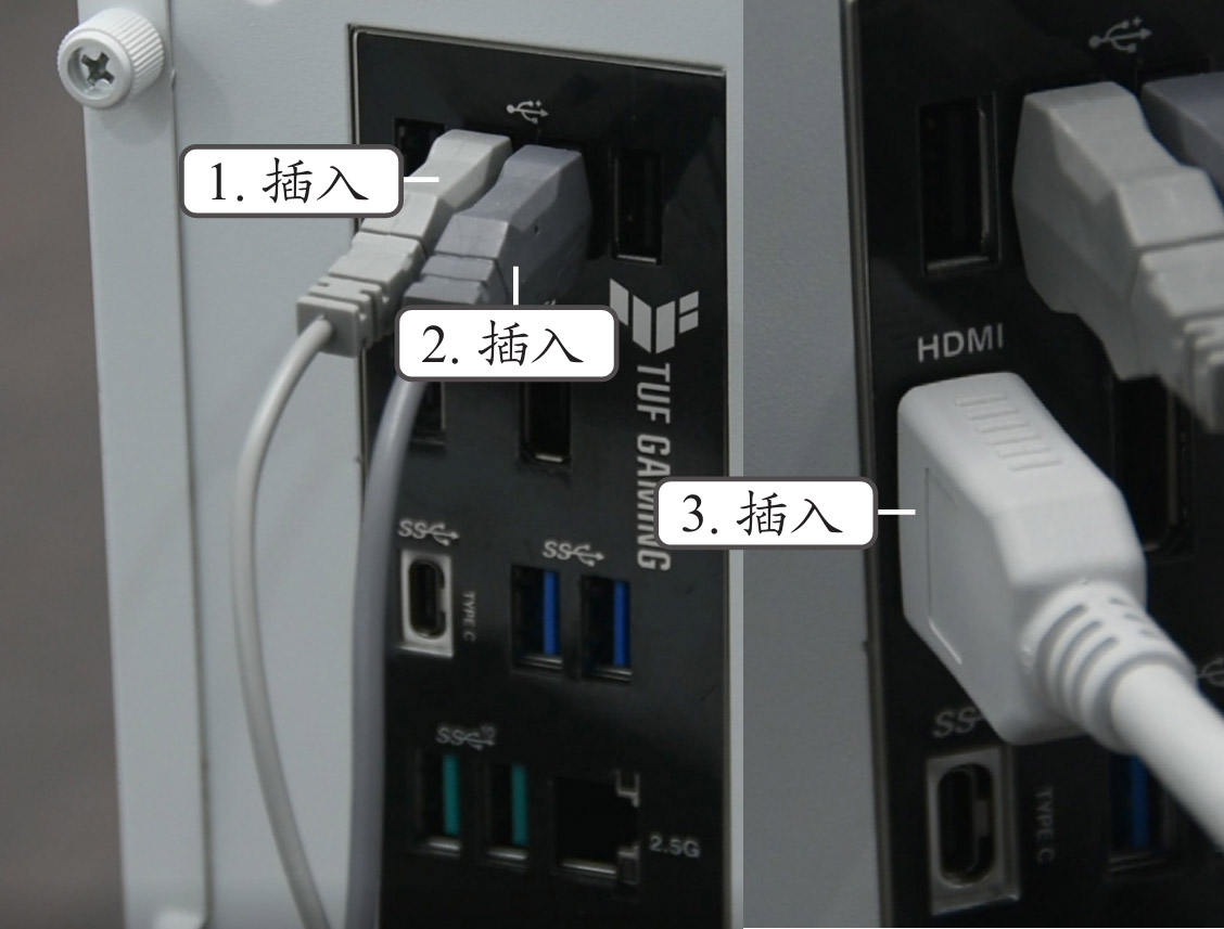 (1)将鼠标和键盘的连接线插头对准主机中主板对外接口的USB接口中,然后再将显示器配置的数据线插头插入主机中主板对应的接口中(这里的显示器数据线采用HDMI),如图1-14所示。