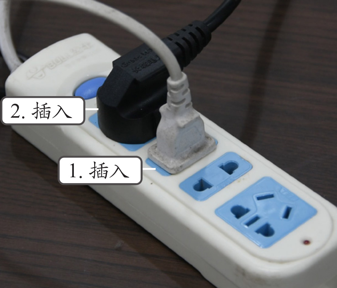 (4)将显示器电源线插头插入插线板中,再将主机电源线插头插入插线板中,如图1-17所示。