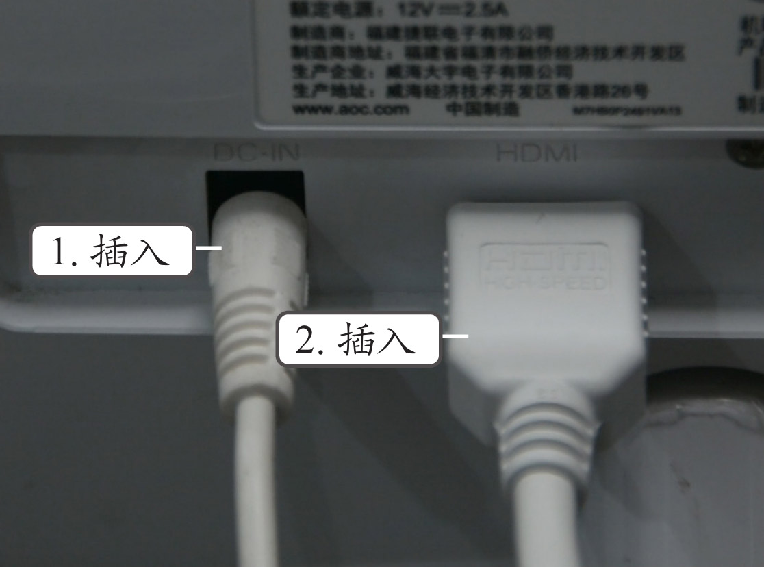 (3)将显示器包装箱中配置的电源线一头插入显示器电源接口中,再将显示器数据线的另外一个插头插入显示器后面的接口中,如图1-16所示。