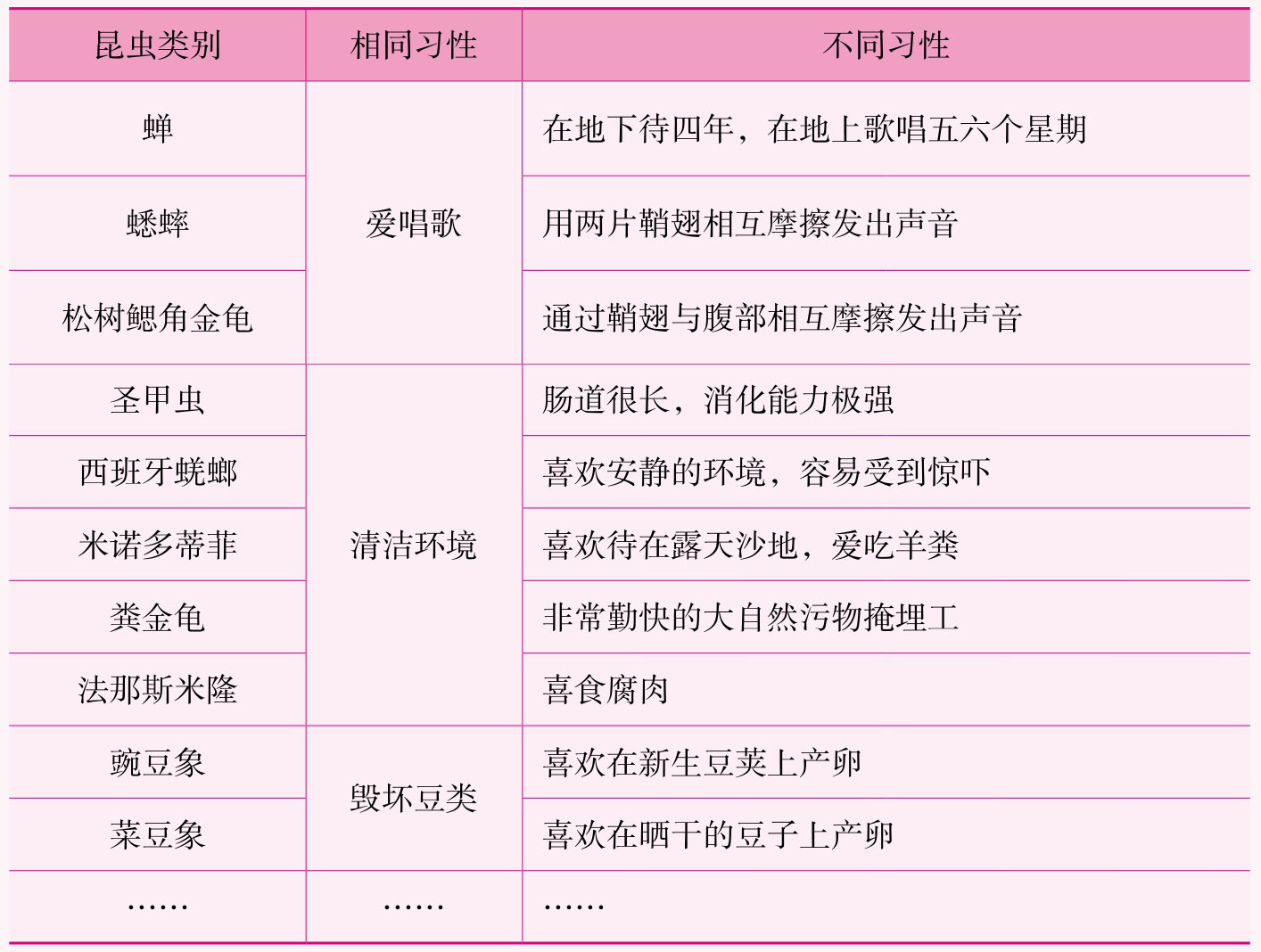 科普作品中的研究对象相对来说比较多、比较杂,我们可以对全书的主要内容进行横向的梳理、归纳和对比,以求更好地把握整本书的内容。可以用思维导图、表格等形式进行梳理。例如,在阅读《昆虫记》的过程中,你会发现法布尔所观察、记录的昆虫有些具有相同的习性:蝉、蟋蟀和松树鳃角金龟都喜欢歌唱,圣甲虫、西班牙蜣螂、粪金龟都是非常勤劳的大自然清洁工,等等。具体示例如下: