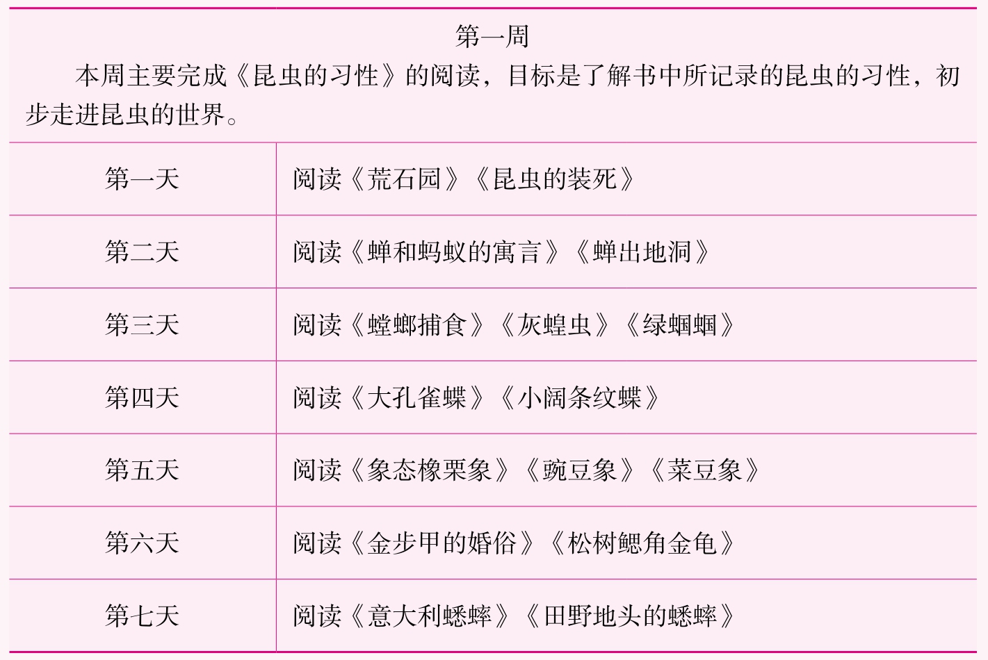 《昆虫记》是法国昆虫学家法布尔耗费近三十年的时间写就的十卷鸿篇巨著,本书从这十卷中精选了二十九篇精彩、有趣的文章集结成册。在阅读时,可以根据自己的阅读习惯来制订自己专属的阅读计划。如果之前有过阅读科普小品的经历,并对昆虫相关知识有一定的了解,可以进行速读;如果是第一次接触此类作品,可以静下心来慢慢阅读;如果对本书的阅读兴趣浓厚,读书动力充足,可以每天多读些内容。以下阅读计划和建议可供参考。