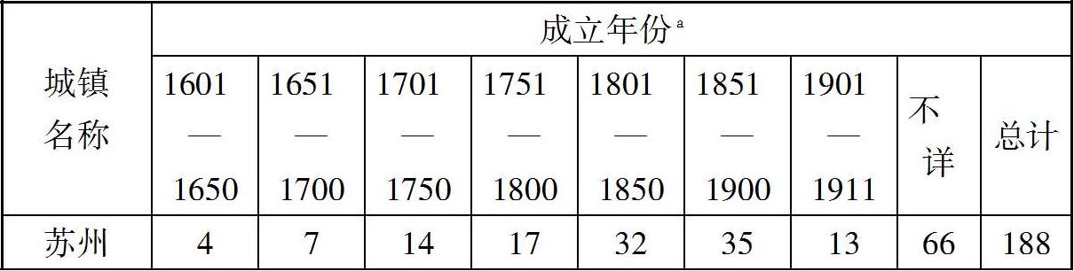 如表1所示,江浙地区工商业行会大约在17世纪初期开始出现。他们不仅在苏州和上海这两个前后相继的区域经济中心城市得到发展,而且还在其他省、府、厅、州、县城及市镇涌现。1600年后,它们的数量因该地区长期的商业化和城市化趋势逐渐增加,1800年后数量激增。由于这一地区的绝大多数行会都是在太平天国运动(1851—1864)被镇压之后重建或新建的,它们的发展主要体现了商人尤其是精英商人在日益严重的社会和国家危机之下结成团体的趋势。