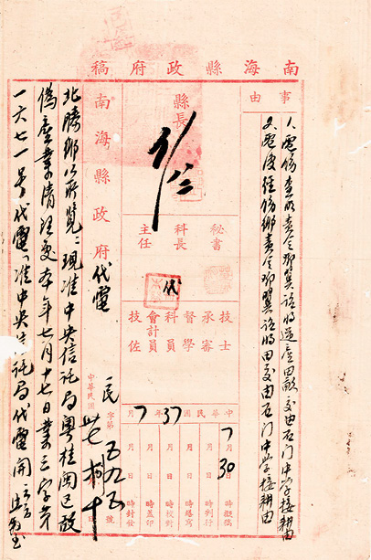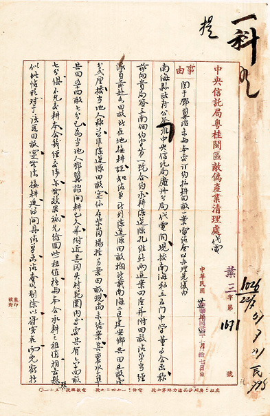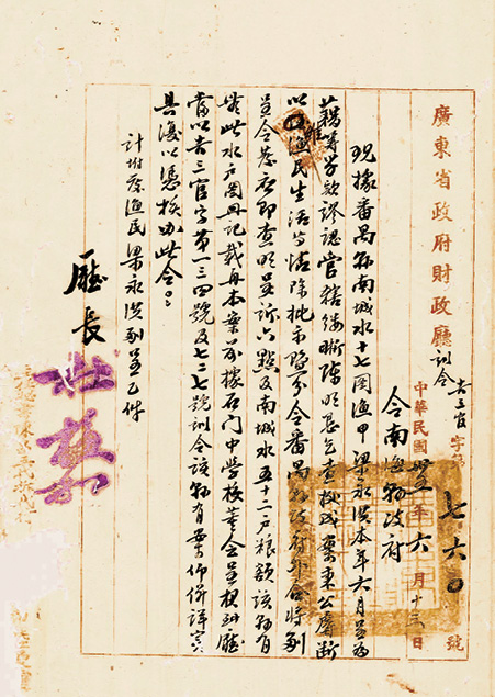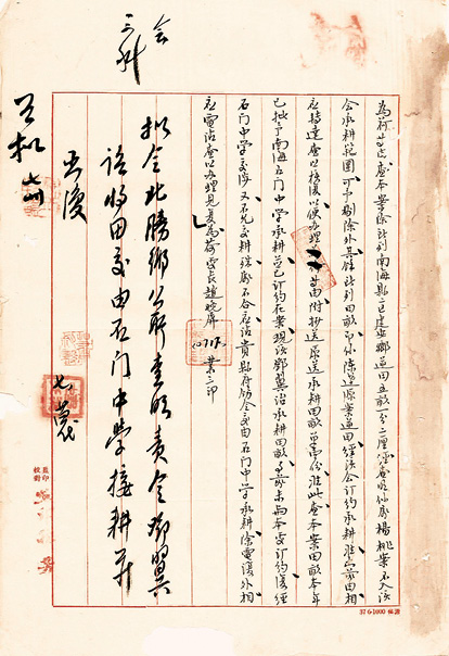 图2-19 南海县政府电令北胜乡公所将敌伪逆产田亩交由石门中学接耕(1948年7月)