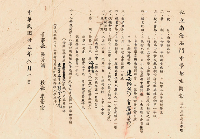 图2-18 1946年8月1日,由董事长区芳浦、校长李景宗签发的《私立南海石门中学招生简章》(1946年度上学期)