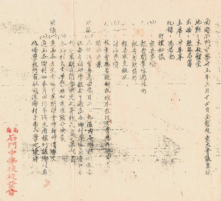 图2-15 南海石门中学校校董会“全体校董大会议案录”(1946年7月14日)