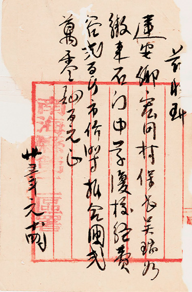 同时收到建安乡麻奢村缴来复校经费谷500斤,折合国币5万元。